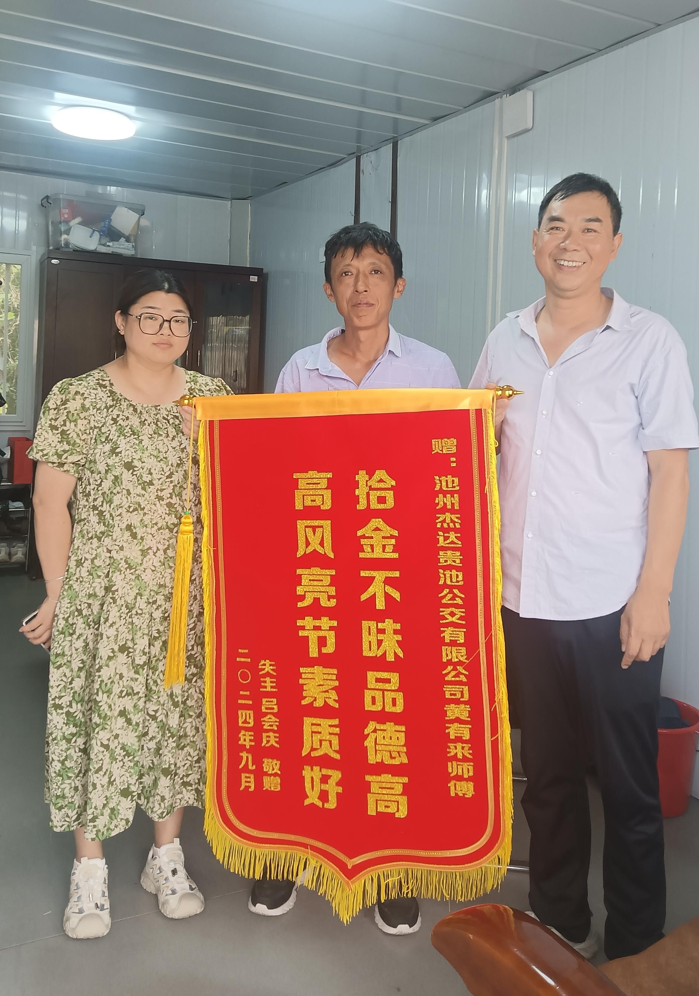 2024年9月12日下午,池州杰達貴池公交公司收到了來自上海呂會慶先生委托其朋友送來的一面錦旗。經(jīng)了解,2024年9月9日下午,公交駕駛員黃有來師傅在執(zhí)行完花廟至貴池的班次任務車輛入庫后,在打掃衛(wèi)生時發(fā)現(xiàn)后座上有一手提袋,外面散落了大量現(xiàn)金,黃有來師傅即刻將手提袋及現(xiàn)金交到調(diào)度室。失主在收到丟失物品后非常激動,送來錦旗以表謝意。黃有來作為一名普通的公交駕駛員,在崗位上展現(xiàn)出拾金不昧的精神,不僅體現(xiàn)了個人高尚的道德品質(zhì)和社會責任感,也傳遞了社會正能量。