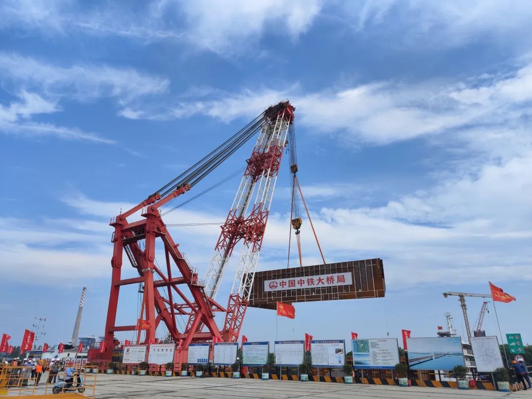 據(jù)悉,南主塔墩(4號墩)圍堰采用雙壁鋼套箱結(jié)構(gòu),總高29米,總重約5558.32噸,共分為四節(jié)吊裝,本次吊裝安裝完成的是底節(jié)圍堰,平面尺寸為80.2米×52.2米,高9米,占地面積相當(dāng)于10個(gè)標(biāo)準(zhǔn)籃球場,高度相當(dāng)于3層樓房。其共分為4塊運(yùn)輸和安裝,單塊重量高達(dá)226.2噸。鋼圍堰在工廠制作完成后,通過自航式甲板貨船經(jīng)320公里的水上運(yùn)輸,到達(dá)指定橋位吊裝下放。