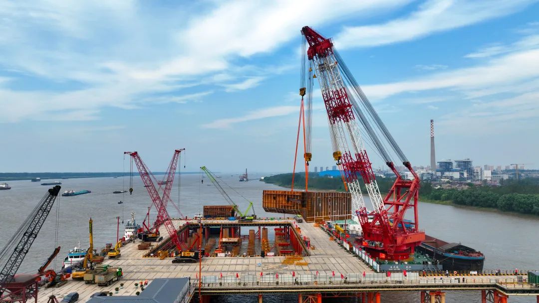 大橋按照“公路+城際鐵路+城市軌道交通”合并過江的標(biāo)準(zhǔn)建設(shè)。上層作為寧樅高速公路的過江通道,按雙向6車道布設(shè),設(shè)計(jì)時(shí)速100公里;下層承載兩線合池城際鐵路,設(shè)計(jì)時(shí)速250公里;預(yù)留兩線池銅市域鐵路,設(shè)計(jì)時(shí)速160公里。池州長江公鐵大橋共設(shè)計(jì)有 42 個(gè)橋墩,其中3號、4號墩為主塔墩,均位于離岸長江水域。7月26日,南主塔墩(4號墩)基77根樁基完成,本次下放的首節(jié)鋼圍堰為樁基上部銜接部分。