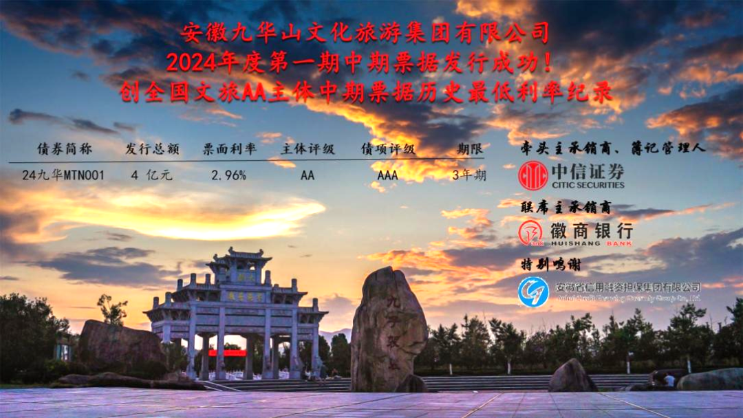 2024年1月26日,文旅集團(tuán)2024年度第一期中期票據(jù)(24九華MTN001)成功發(fā)行。募集資金規(guī)模4億元,期限3年,票面利率2.96%,認(rèn)購(gòu)倍數(shù)4.9倍,創(chuàng)全國(guó)文旅AA主體中期票據(jù)歷史最低利率記錄!