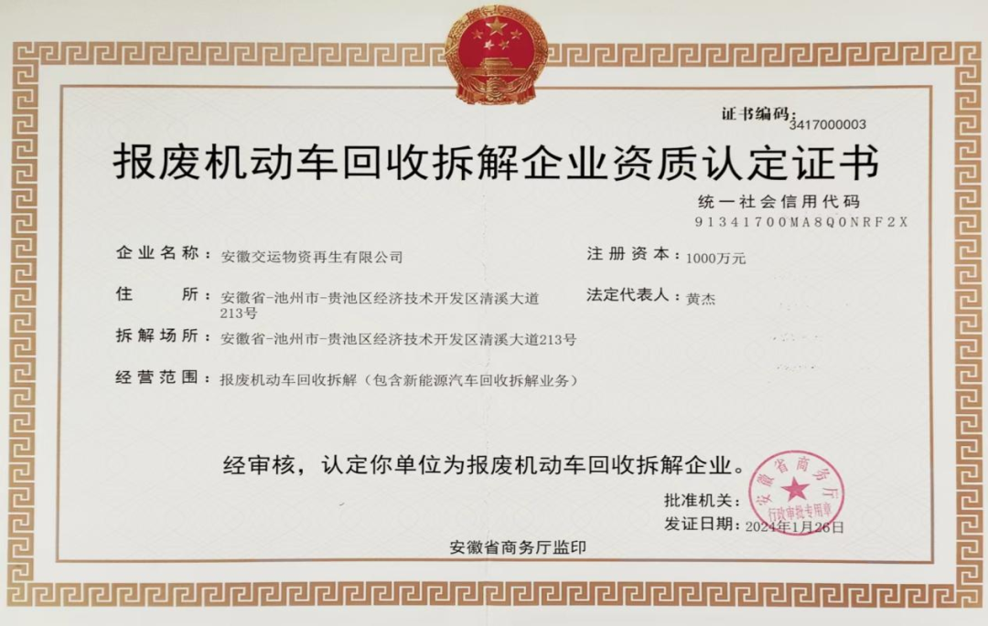 近日,集團(tuán)所屬安徽交運物資再生有限公司順利通過安徽省商務(wù)廳批準(zhǔn),成功獲得報廢機動車回收拆解企業(yè)資質(zhì)認(rèn)定證書 。