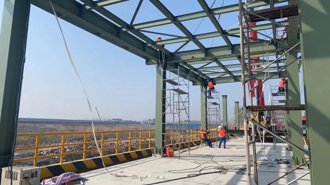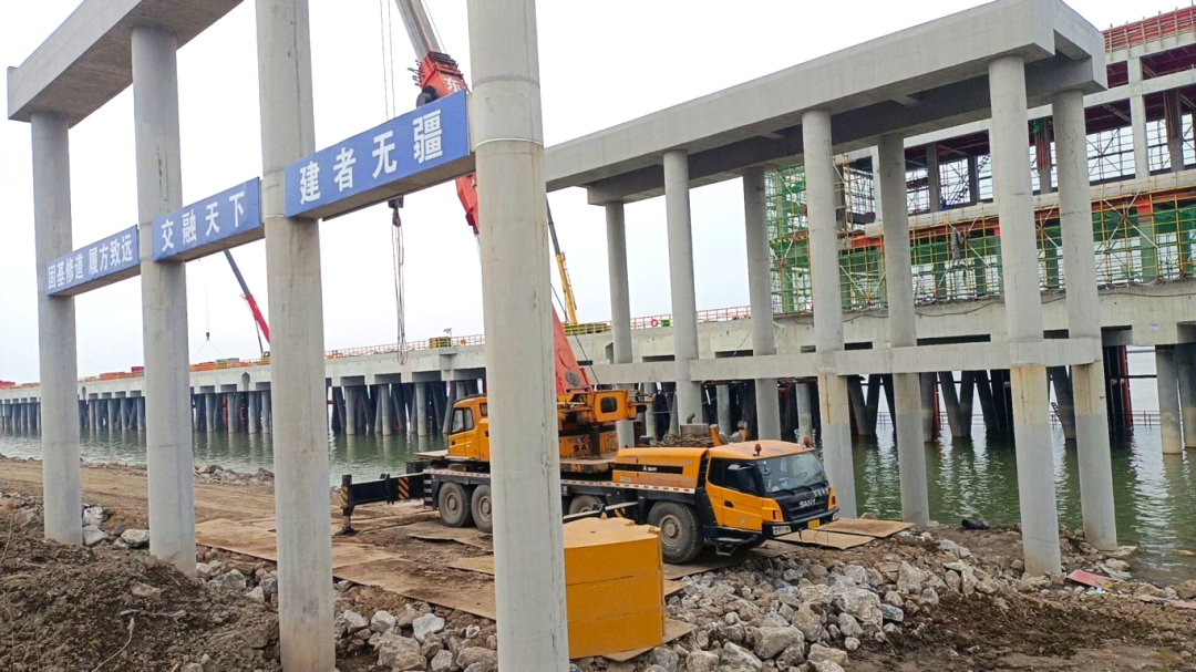 截至目前,項目水域部分碼頭平臺面層、兩座汽車引橋已全部澆筑完成,項目整體進度已完成約83%,碼頭工程主體結構與房建工程主體結構已全部施工完成,正在進行碼頭前沿鋼結構安裝、裝船機焊接打磨進行拼焊、房建工程進行內部砌墻、鋼引橋吊裝、水域部分進行系纜欄桿安裝、橡膠護舷安裝、鋼軌安裝。碼頭陸域部分已進場工作,臨時道路及部分場地硬化已完成,正在進行B2轉運樓及管理用房區(qū)域內基礎施工,水泥攪拌樁已開展工作。