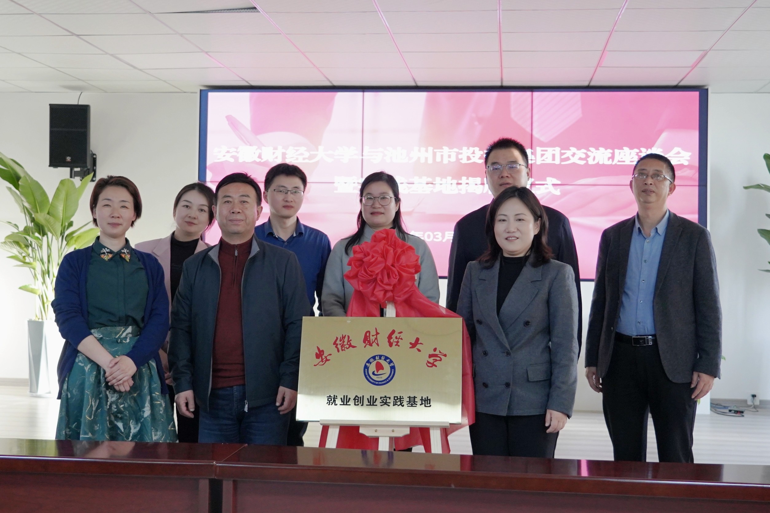 安財校黨委常委、副校長趙曉明,池州市人社局黨組成員、市人事考試指導中心主任章和平與集團黨委副書記、工會主席嚴艷共同為“安徽財經大學就業(yè)創(chuàng)業(yè)實踐基地”揭牌。