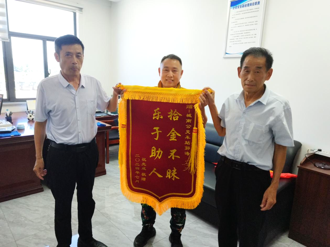 7月4日下午,東至縣木塔鄉(xiāng)居民祝先生將一面寫有“拾金不昧 樂于助人”的錦旗送到了東至公共交通有限公司,以此向擔任縣城至利安木塔駕駛員郭濤師傅表示感謝。據(jù)了解,祝先生于3日下午乘坐縣城至利安木塔最后一班公交車回家,不慎將自己的錢包掉落在公交車上。車到目的地后,郭師傅在打掃公交車衛(wèi)生時,發(fā)現(xiàn)乘客遺落的錢包,通過查看,包內(nèi)有身份證、醫(yī)療卡、銀行卡等證件和現(xiàn)金1200元。郭師傅擔心失主著急,通過身份證,輾轉(zhuǎn)找到熟悉的朋友,后又由朋友找到祝先生所在村村書記。通過村書記聯(lián)系到失主本人。在祝先生當面表示感謝時,郭師傅表示,“這都是自己應該做的。”