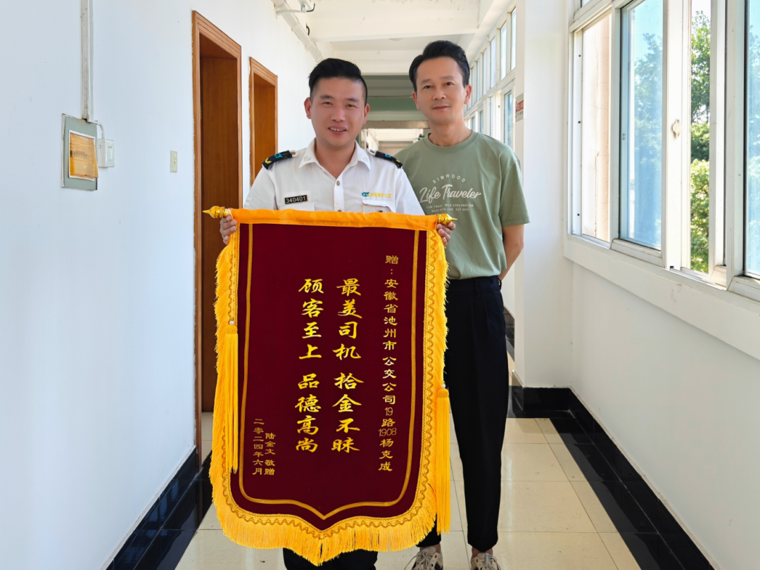 6月25日下午,池州市城市公共交通有限公司收到了乘客陸先生從河北郵寄來的一面錦旗。6月23日早上7:40分,城市公交客服熱線接到了乘客陸先生打來的電話,陸先生表示自己的手機和身份證丟了,半小時前乘坐過19路公交車。調(diào)度員在了解情況后立刻通過調(diào)度系統(tǒng)鎖定車輛并聯(lián)系公交師傅。楊克成師傅在靠站后找到了一個手機和一個身份證,立刻拍照發(fā)給調(diào)度中心進行了核實,并對物品進行了保管。上午10:30分,陸先生在1908車楊克成師傅手上接過了自己遺失的手機和身份證,激動萬分,表示手機里的文件非常重要,能夠這么快完好無損的找回來自己很開心,非常感謝楊師傅。楊師傅表示“拾金不昧,物歸原主”是自己作為駕駛員應該做的,哪怕是一根針一根線我們找到了都會保管好還給乘客。